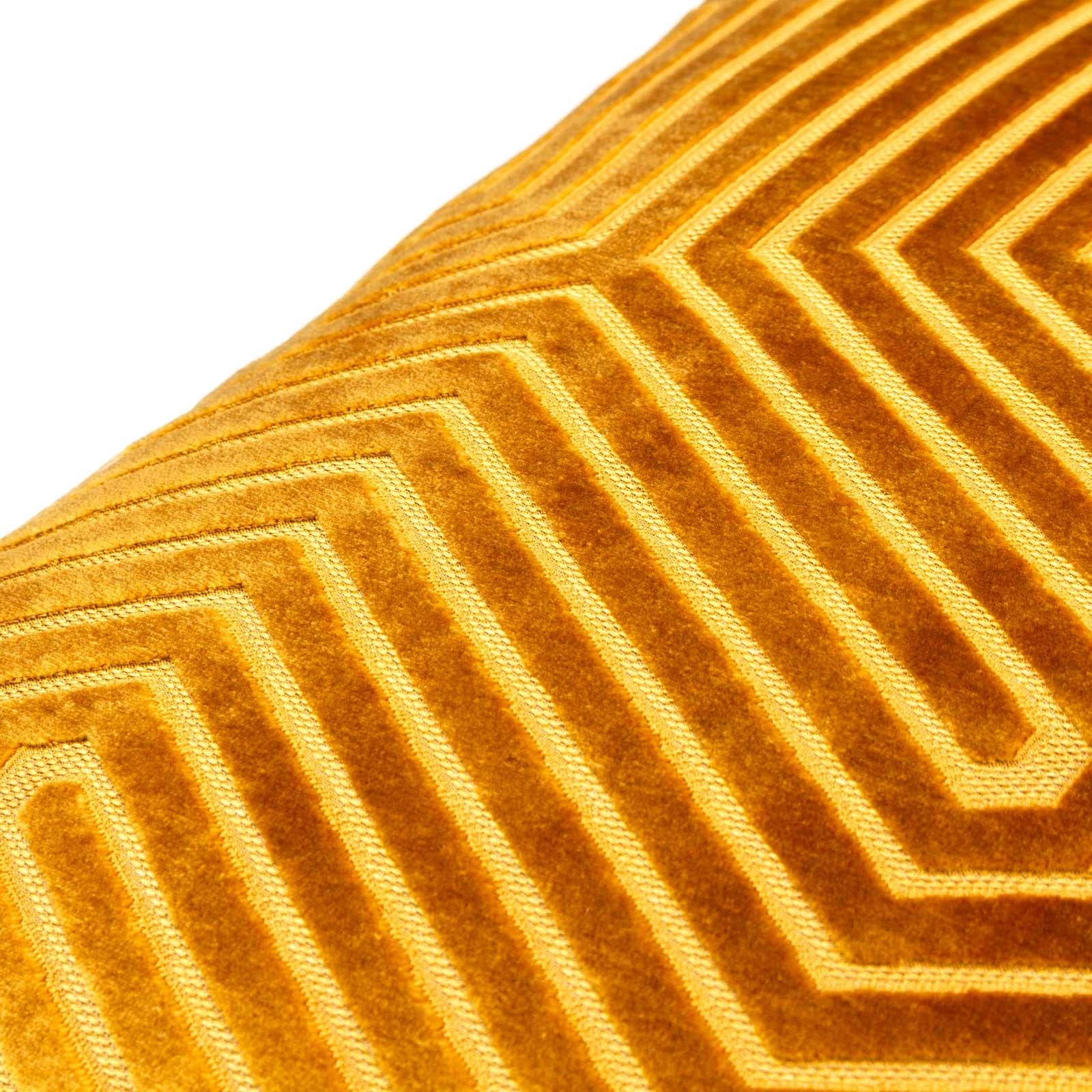 Transform your living space with our luxuriously designed cushion cover, featuring mesmerizing geometric cut velvet detailing that exudes sophistication and style. The elegant design is enhanced by metallic threads woven through the fabric, creating a bold golden weave that stands out against a rich, jewel-toned background. Each cushion cover is meticulously finished with a smart knife-edged trim, a hidden zip closure, and a soft plain velvet reverse, adding both beauty and functionality to your décor.